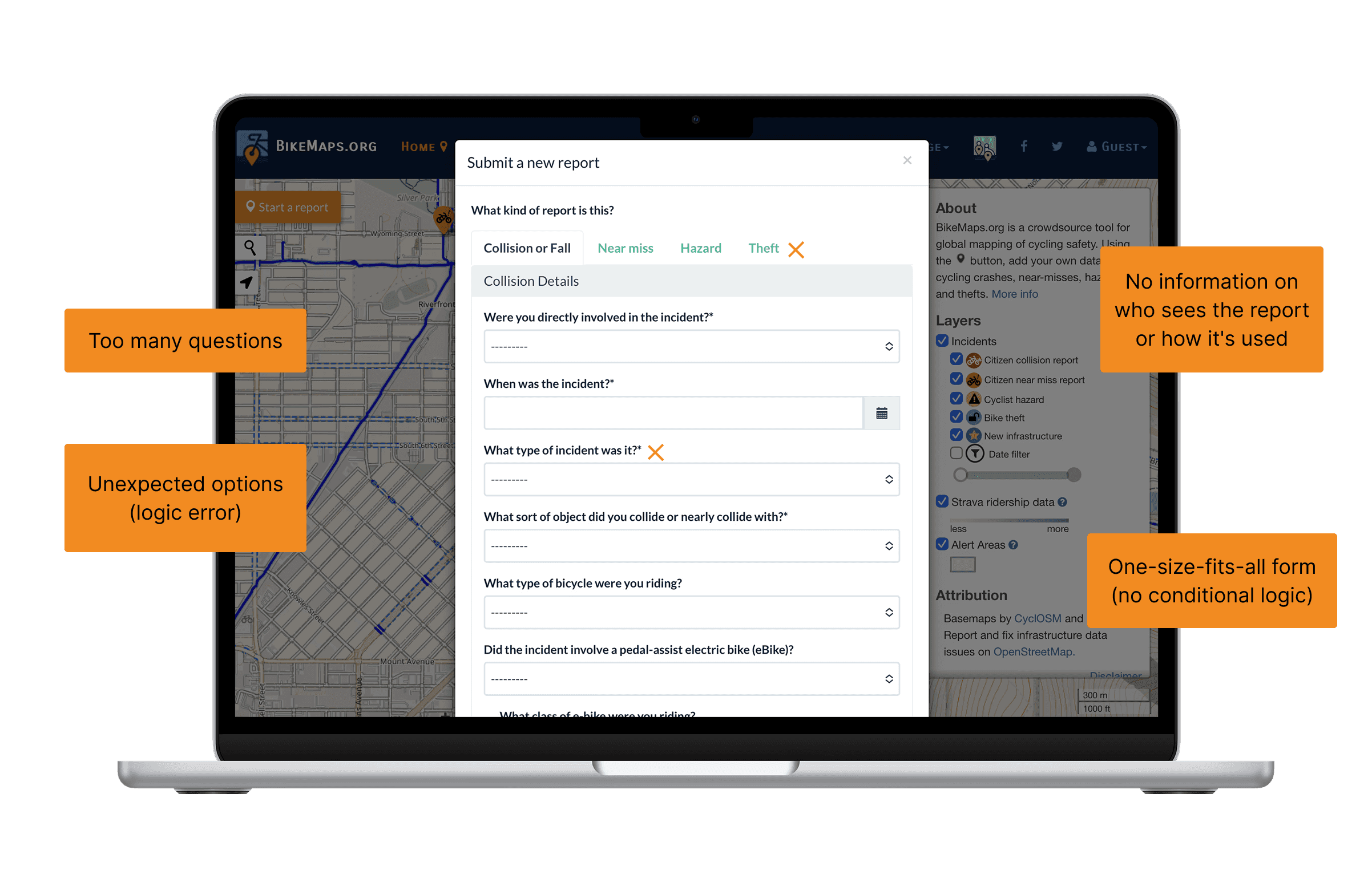 BikeMaps.org is a is a global tool that allows people to map cycling collisions, near misses, hazards, and thefts, creating an interactive database of cycling experiences to improve cycling safety. I partnered with them to enhance the usability and overall user experience of the platform to increase accident reporting and strengthen local advocacy.